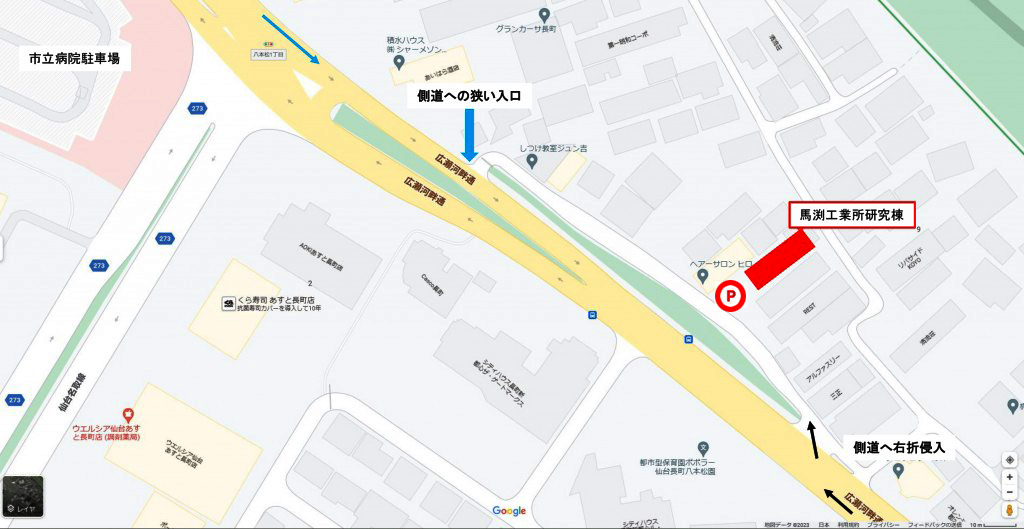【 仙台市街地より南進の場合 】 青矢印に従い、八本町1丁目交差点を直進後、狭い入口より側道(研究棟前面道路)へと進行